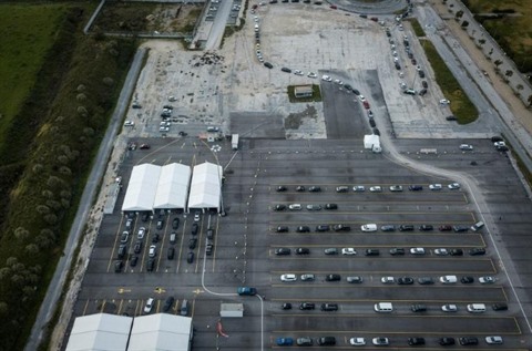 | Vue aérienne d'un centre de tests en drive-in à Sacavem, dans la banlieue de Lisbonne, le 22 janvier 2021. |