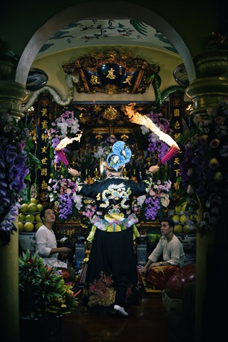 C’est le médium, vedette de la séance, qui incarne la fonction de médiation, intercédant auprès des esprits pour les êtres humains. Homme ou femme, ce chaman est toujours bien maquillé avec poudre, fard à joue et rouge à lèvres.