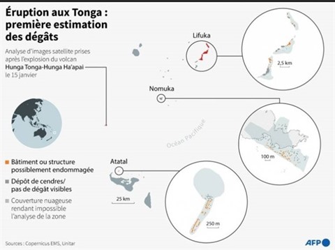 Le gouvernement des Tonga a qualifié l'éruption de catastrophe "sans précédent", précisant que des vagues atteignant jusqu'à 15 m de hauteur ont détruit toutes les habitations sur certaines îles. Trois personnes ont été tuées.
