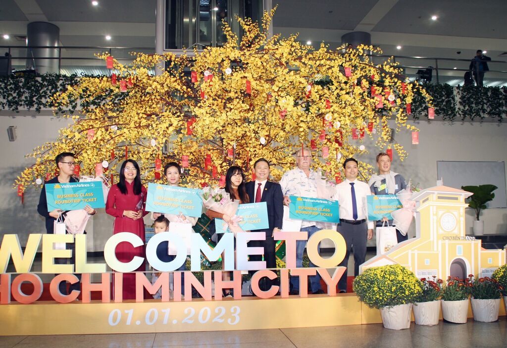 À l'aéroport international de Tân Son Nhât à Hô Chi Minh-Ville, le Service municipal du tourisme et la compagnie aérienne nationale Vietnam Airlines ont offert des billets aller-retour intérieurs et en classe business à six passagers chanceux choisis sur le vol VN30 parti de Francfort en Allemagne et atterrissant dans la ville à 7h25 le 1er janvier.