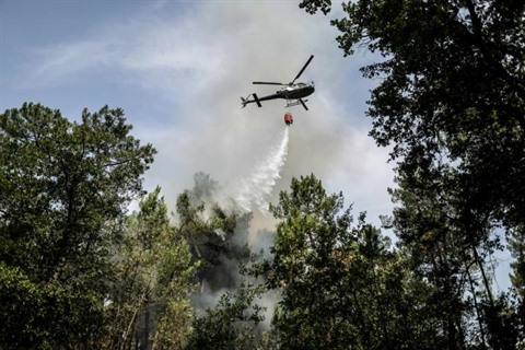 | Un hélicoptère largue de l'eau sur la forêt près de Belin-Béliet (Gironde), le 13 août. |