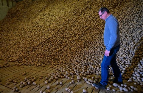 | Christophe Delebarre, producteur de pommes de terre dans le Nord, devant son stock invendu le 15 mai. |