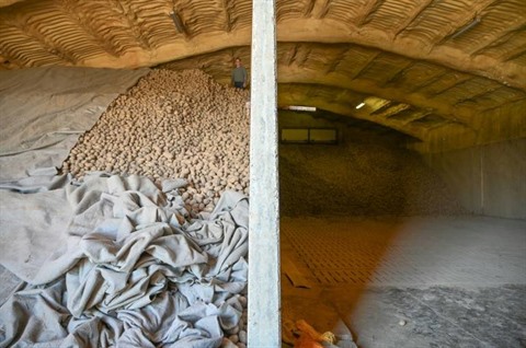 | Le hangar de pommes de terre invendues du producteur Christophe Delebarre à Givenchy-lès-La-Bassée (Nord) le 15 mai. |