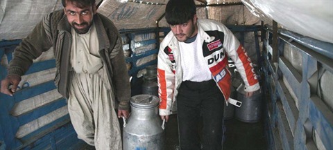 | Des travailleurs laitiers transportent un bidon de lait en Afghanistan. |