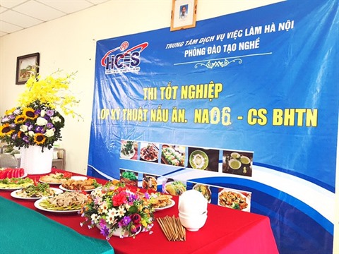 Fermez les yeux. Imaginez que vous avez faim, très faim même et que là, devant vous, sur une grande table, s’étalent des kyrielles de plats, tous plus alléchants les uns que les autres… Des salades de concombres et de tomates aromatisées au citron, des lamelles de veau accompagnées de minuscules galettes soufflées, des filets de bœuf au poivre noir, du poisson au gingembre cuit à la vapeur, du poulet rôti… Le festin peut commencer ? Eh bien non, car ce n’est pas d’un festin à proprement parler qu’il s’agit, mais d’une séance de fin d’études - eh oui ! - qui a lieu, comme tous les trois mois, au Centre de formation professionnelle pour les chômeurs de Hanoï, celui qui se trouve rue Trung Kinh.