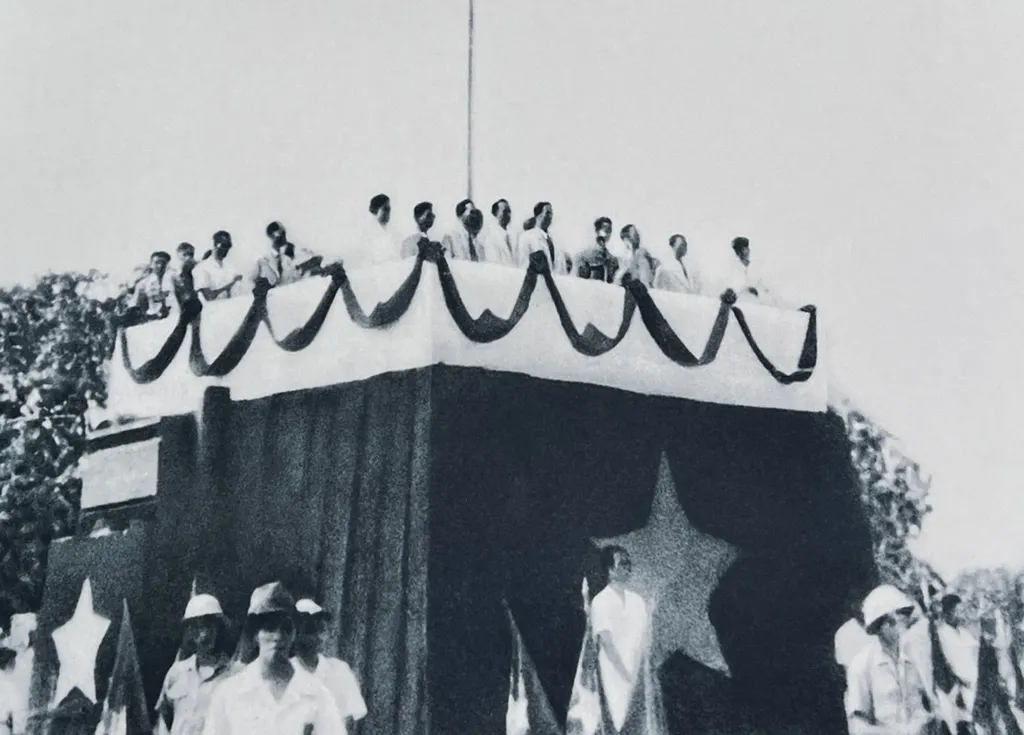 Le 2 septembre 1945, sur la place Ba Dinh, devant une foule de 500.000 personnes, le Président Hô Chi Minh proclama solennellement l’indépendance. Dans son costume kaki simple, sans aucune décoration ni médaille, il prononça ces paroles immortelles :