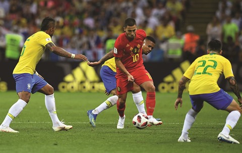 | L’attaquant belge Eden Hazard (centre) lors du match contre le Brésil, en quart de finale, le 6 juillet. |