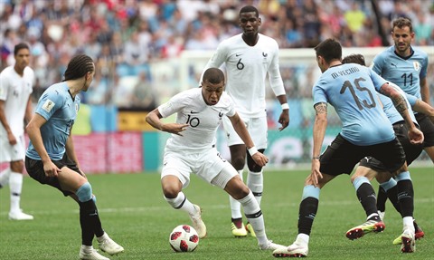 | Le Français Kylian Mbappé (10) lors du match contre l’Uruguay en quart de finale, le 6 juillet. |