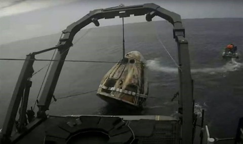 | La capsule Dragon de SpaceX récupérée après son amerrissage dans l'Océan Atlantique, au large des côtes de Floride, au terme de la mission privée Ax-1, le 25 avril. |