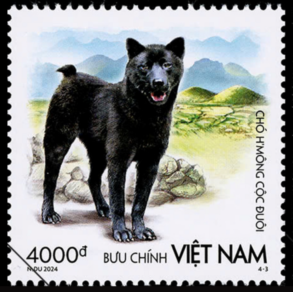 Le chien H'mông à queue courte, originaire des provinces montagneuses du Nord comme Hà Giang, Lào Cai, Lai Châu et Diên Biên, est parfaitement adapté aux terrains escarpés. Il figure sur un timbre avec, en arrière-plan, une représentation pittoresque du Nui Dôi, situé dans la région de Quan Bạ, Hà Giang.
