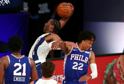 | L'arrière d'Indiana T.J. Warren va au panier malgré la défense de Matisse Thybulle lors de la victoire sur les Philadelphia 76ers en NBA le 1er août 2020 à Lake Buena Vista, en Floride. |