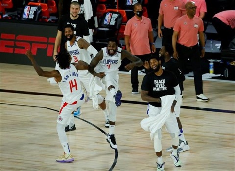 | Les Clippers lors de leur victoire sur les New Orleans Pelicans en NBA à Lake Buena Vista, en Floride, le 1er août 2020. |