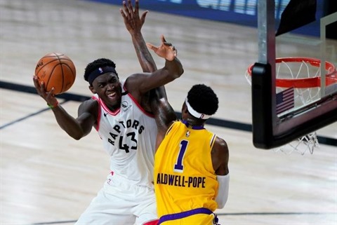 | Le joueur camerounais des Toronto Raptors Pascal Siakam au duel avec Kentavious Caldwell-Pope des Los Angeles Lakers en NBA le 1er août 2020 à Lake Buena Vista, en Floride. |
