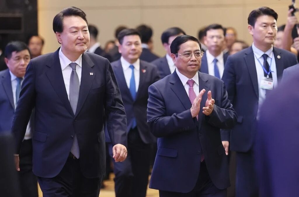 | Le Premier ministre Pham Minh Chinh (droite) et le président sud-coréen Yoon Suk Yeol lors du Forum des affaires République de Corée - Vietnam. |