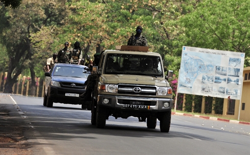 | Des véhicules de l’armée en patrouille dans une rue de Bamako, le 1er avril. |