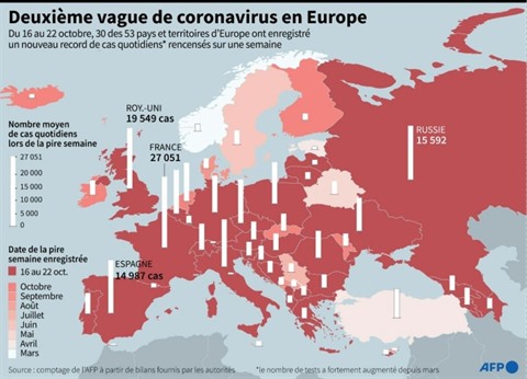 Le couvre-feu a déjà été instauré dans plusieurs pays européens, dont une partie de la France, où là aussi, l'épidémie a battu un nouveau record avec 52.010 nouveaux cas en 24 heures pour un total de 34.761 morts depuis le début de l'épidémie.