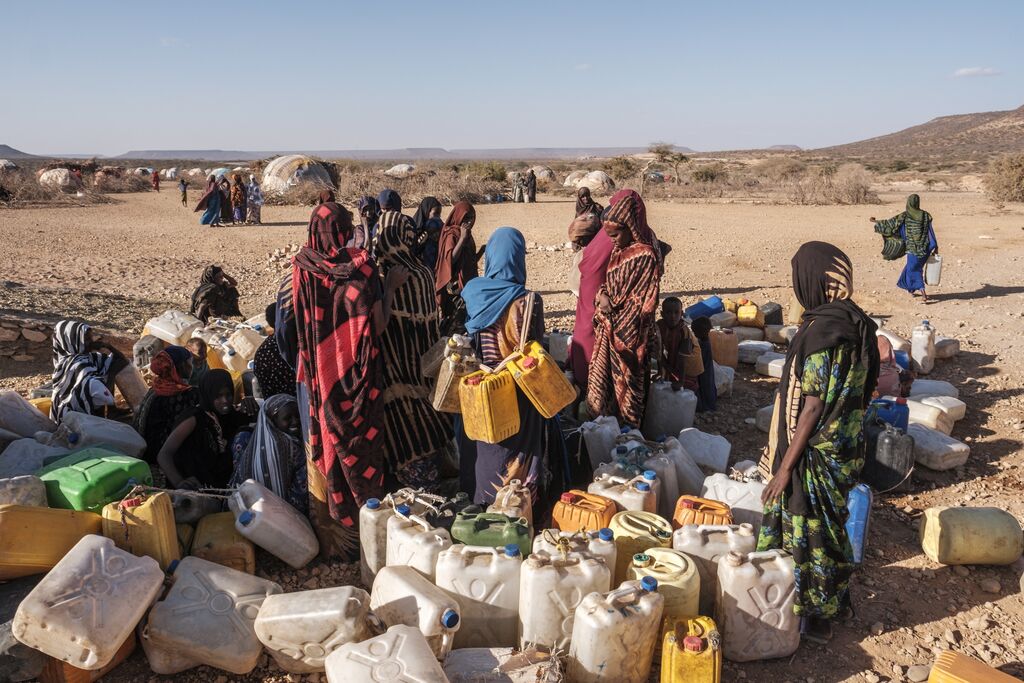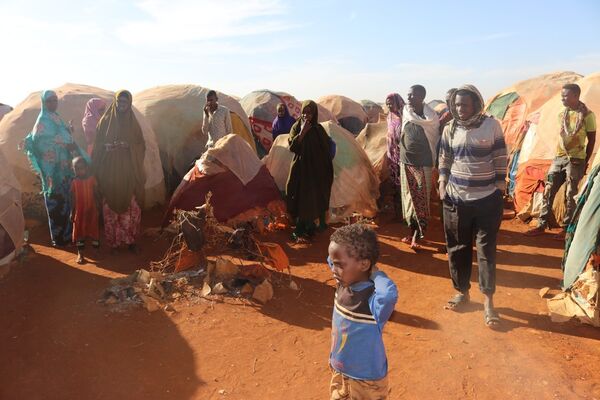 | Des réfugiés avec leur jerricans pour stocker de l'eau dans un abri de fortune à Gode, en Ethiopie. |