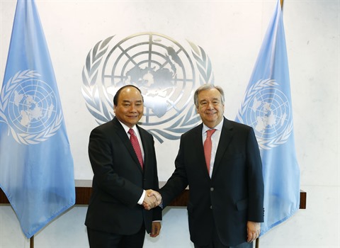| Le Premier ministre vietnamien Nguyên Xuân Phuc (gauche) et le secrétaire général de l'ONU, Antonio Guterres, le 30 mai à New York. |
