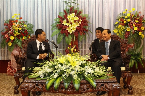 | Le secrétaire de l'organisation du Parti de Hô Chi Minh-Ville, Lê Thanh Hai (droite), reçoit le 26 mai dans la mégapole du Sud, le gouverneur de la région de Rangoun (Myanmar), U Myint Swe. Photo : Thanh Vu/VNA/CVN |