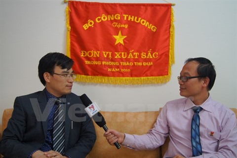 | Le chef du Service du commerce de l’ambassade du Vietnam en Inde, Bùi Trung Thuong (gauche), répond au correspondant de la VNA. |