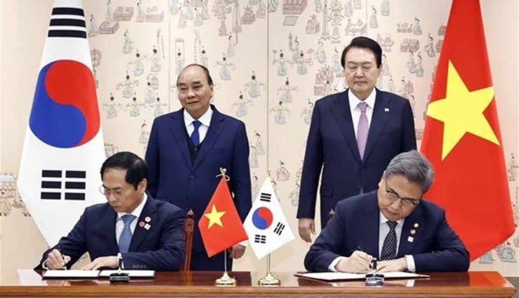 | Le président vietnamien Nguyên Xuân Phuc (droite) et le président sud-coréen Yoon Suk Yeo assistent à la signature d'accords de coopération entre les deux pays. |