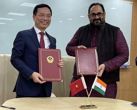| Les ministres Nguyên Manh Hùng (gauche) et Shri Rajeev Chandrasekhar à la cérémonie de signature du protocole d'accord sur la coopération bilatérale dans les technologies de l'information et l'électronique, le 17 décembre 2021. |