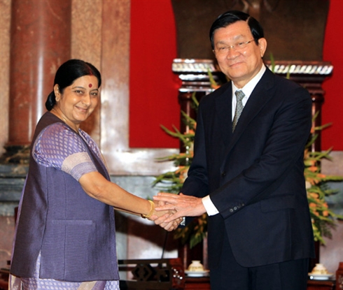 | La ministre indienne des Affaires étrangères, Sushma Swarai, et le président de la République, Truong Tân Sang, le 25 août à Hanoi. |