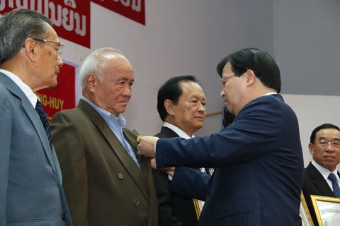 | Trinh Dinh Dung (droite) remet, le 6 octobre, l'Ordre de l'Indépendance aux ex-fonctionnaires du ministère des Travaux publics et des Transports du Laos. |