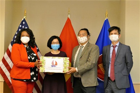 | La conseillère d'ambassade Hoàng Thi Thanh Nga (2e à gauche) offre, le 30 juin à Washington, les masques de protection à la partie américaine. |