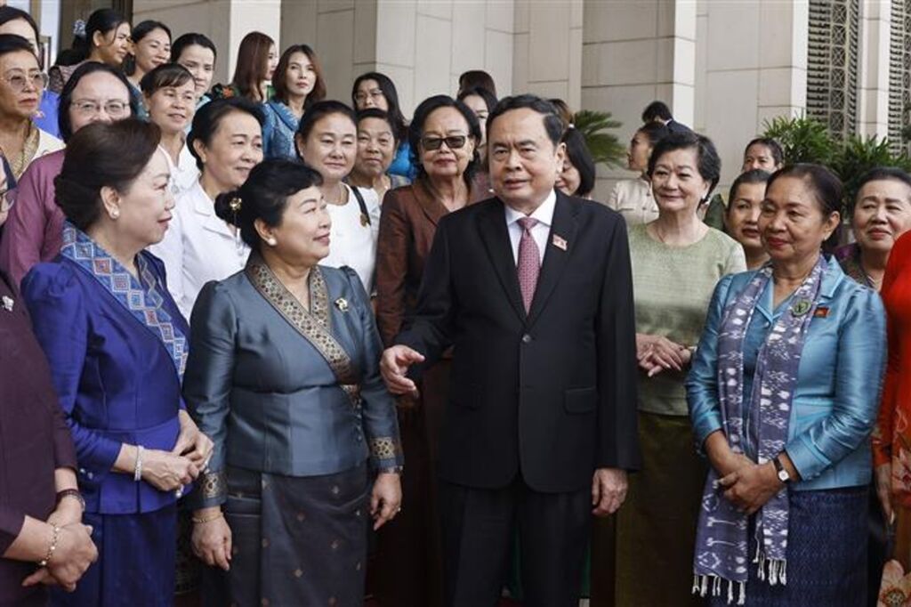 | Le président de l'AN, Trân Thanh Mân, et des représentantes des Unions des femmes du Laos et du Cambodge, ainsi que des femmes d'affaires de ces deux pays, le 4 juillet. |
