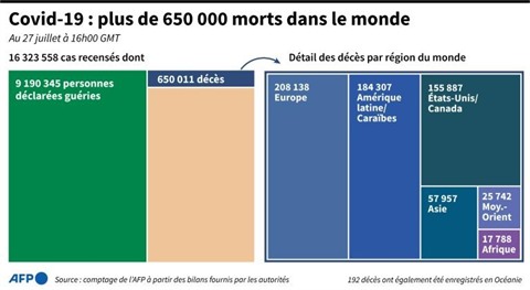 Sept mois après son apparition en Chine, le virus, pour lequel aucun vaccin n'a encore été trouvé, continue de circuler activement, alimentant les craintes d'une seconde vague aux enjeux économiques et sociétaux potentiellement désastreux. Selon le dernier bilan établi par l'AFP lundi soir 27 juillet, les États-Unis restent le pays le plus endeuillé (146.968 décès) devant le Brésil (87.004), le Royaume-Uni (45.752), le Mexique (43.680) et l'Italie (35.112). En l'espace de 24 heures, 57.000 nouveaux cas et 679 morts supplémentaires ont été recensés sur le sol américain, selon l'université Johns Hopkins.