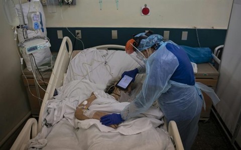 | Le docteur Moyra Lopez fait écouter à un patient en soins intensifs un message d'adieu de ses proches sur un Ipad, le 22 juillet à l'hôpital Barros Luco de Santiago du Chili. |