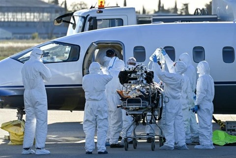 | Des équipes médicales embarquent dans un avion un patient atteint du COVID-19, le 27 octobre à l'aéroport de Saint-Gilles (France). |