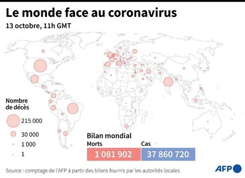 La pandémie du nouveau coronavirus a fait au moins 1,08 million de morts dans le monde depuis fin décembre, selon un bilan réalisé par l'AFP à partir de sources officielles mardi 13 octobre.