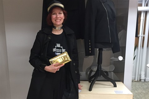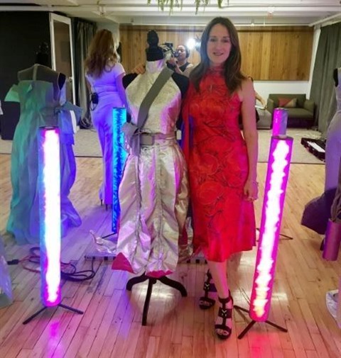 | Clare Tattersall pose avec une robe connectée qu'elle a réalisé avec la technologie de la société 360Fashion Network. |