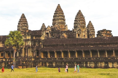 | Touristes au temple d’Angkor Wat, à Siem Reap (Cambodge). |