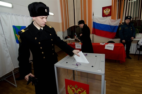 | Dans un bureau de vote à Vladivostok (Extrême-Orient), le 4 mars. |