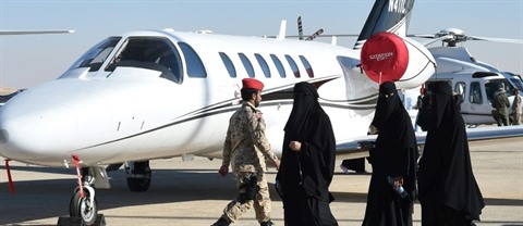 | Des Saoudiennes visitent un salon de l'aviation à l'aéroport de Thumamah, le 11 janvier 2018. |