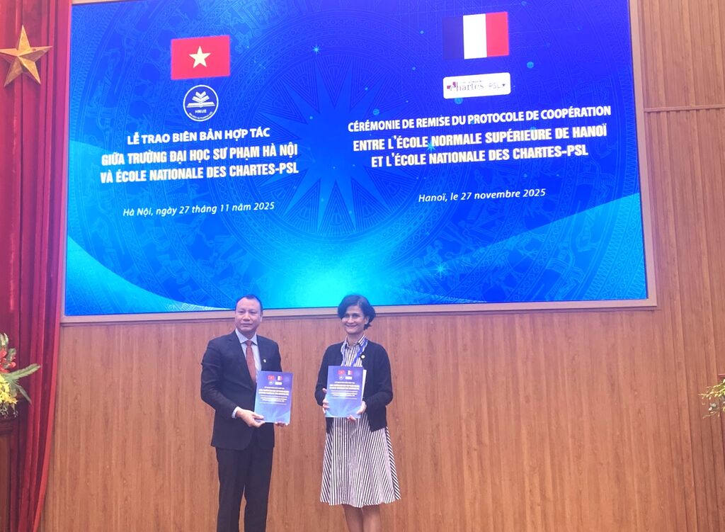 | Échange du protocole de coopération entre l’École normale supérieure de Hanoï et l’École nationale des chartes-PSL, le 27 novembre. |