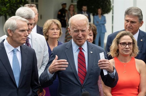 | Le président américain Joe Biden annonce un accord sur un plan d'investissements massifs dans les infrastructures aux côtés d'un groupe de sénateurs républicains et démocrates, le 24 juin devant la Maison Blanche. |