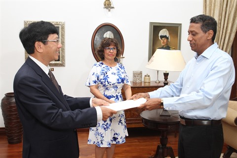 | L'ambassadeur du Vietnam au Mozambique et aux Seychelles, Lê Huy Hoàng (gauche) présente ses lettres de créance au président des Seychelles, Danny Faure, le 17 septembre. |