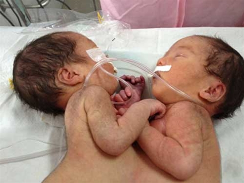 | Les deux sœurs siamoises reliées la poitrine et l'abdomen. |