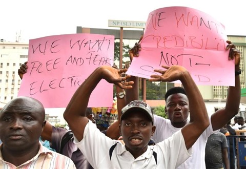 | Des manifestants réclament des élections libres et équitables devant la Haute cour de justice, le 26 mars 2018 à Freetown. |