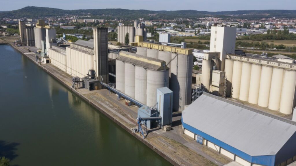 | Cette image prise par drone montre des silos à grain sur les rives de la Moselle, dans le port de Metz, le 25 août 2022. |