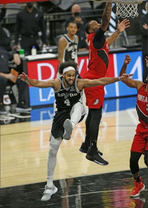 | Norman Powell marque pour les Portland Trailblazers contre les San Antonio Spurs, le 16 avril 2021, au AT&T Center à San Antonio. |