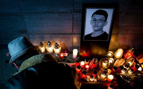 | Des bougies devant le portrait du journaliste assassiné Jan Kuciak, le 26 février 2018 à Bratislava, en Slovaquie. |