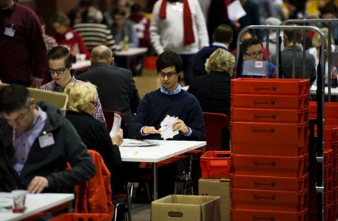 | Des bénévoles participent au dépouillement des voix après un vote des militants du parti social démocrate allemand (SPD), le 14 décembre à Berlin. |