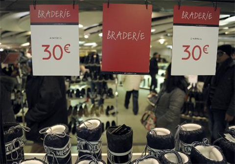 | Articles en soldes dans la vitrine d’un grand magasin, le 7 janvier à Paris |