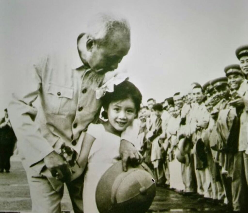 | La petite Wang Feng et le Président Hô Chi Minh, le 20 mai 1957 à l'aéroport de Gia Lâm, à Hanoï. |