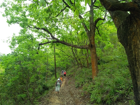 Après une heure de marche, nous avons l’impression d’être fatigués. Notre équipe décide de choisir les troncs de bois morts sur le chemin pour faire une pause. En reposant, quelques blagues, quelques histoires de fantômes et même des bêtises racontées… pour faire rire, pour reprendre de l’énergie, et pour chasser la fatigue. Un petit repos dure quelques minutes, et puis nous devons repartir pour sortir de la forêt. Incroyable ! Un paysage spectaculaire s’ouvre devant nos yeux: le ciel bleu, le rayon du soleil reflète dans les rizières inondées comme l’image du miroir brillant de la nature. Nous sortons les appareils photo pour ne pas rater ce beau paysage! Nous continuons la marche en suivant le chemin plat en balcon.